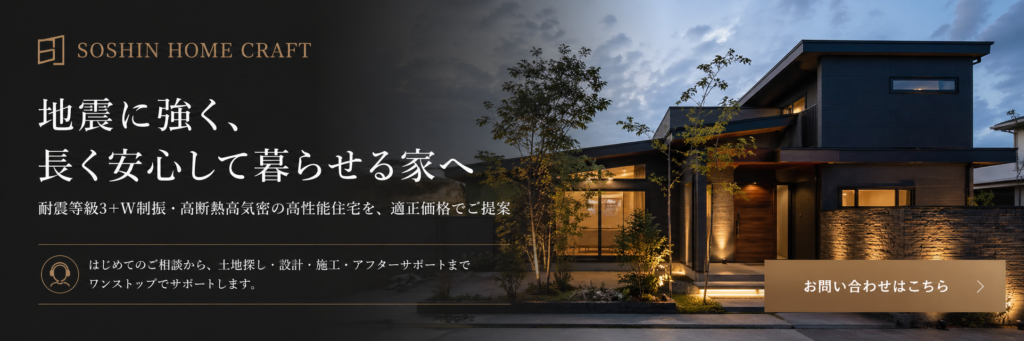 SOSHIN HOME CRAFTでは、耐震等級3+W制振をはじめ、高断熱・高気密まで考えた家づくりをご提案しています。